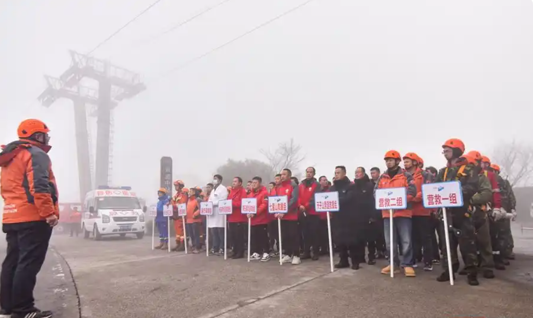 演習正式開始,運行中的天門山索道突然停止,模擬轎廂中的乘客被困。今日山頂飄雪,演習現(xiàn)場大霧彌漫,能見度極低,這為救援行動增添了額外的難度和緊迫感。雖然現(xiàn)場氣溫接近0°,但救援人員已經大汗淋漓。